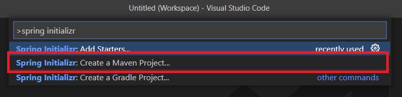 먼저, [Ctrl] + [Shift] + [P] 혹은 상단 메뉴 [View] > [Command Palette]를 실행하여, Spring Initializr를 입력합니다. 아래와 같이 Maven/Gradle 프로젝트를 선택하여 생성할 수 있는데 여기서는 Maven 프로젝트를 생성해보도록 하겠습니다.