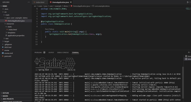 이제 프로젝트를 실행을 하겠습니다. main>java.com.example.demo 밑에 @SpringBootApplication과 함께 자동으로 생성된 DemoApplication.java 파일을 선택 후, [F5] 혹은 우측 상단에 Run Java 아이콘을 클릭하면 프로젝트가 실행이 됩니다.