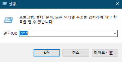 win키 + R을 눌러 실행창을 열고 cmd를 입력하여 명령프롬프트를 엽니다.