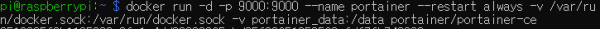 | > docker run -d -p 9000:9000 --name portainer --restart always -v /var/run/docker.sock:/var/run/docker.sock -v portainer_data:/data portainer/portainer-ce |