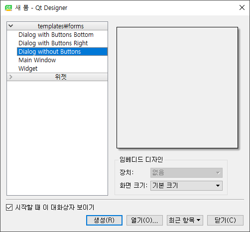 만약 Qt Designer가 제대로 실행되었다면, 가장 처음 보이는 화면은 아래와 같습니다. (Window OS 기준)