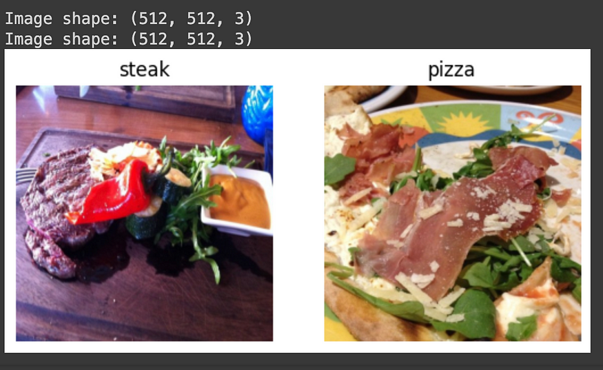 Let’s get started by importing dataset. At first, a zip file containing pizza and steak images is first downloaded using the wget command from a Google Cloud Storage URL. This file is intended for use in a food vision project. Following the download, the Python zipfile module is utilized to open the pizza_steak.zip file in read mode, extract its contents to the current working directory, and then close the file to efficiently manage system resources.