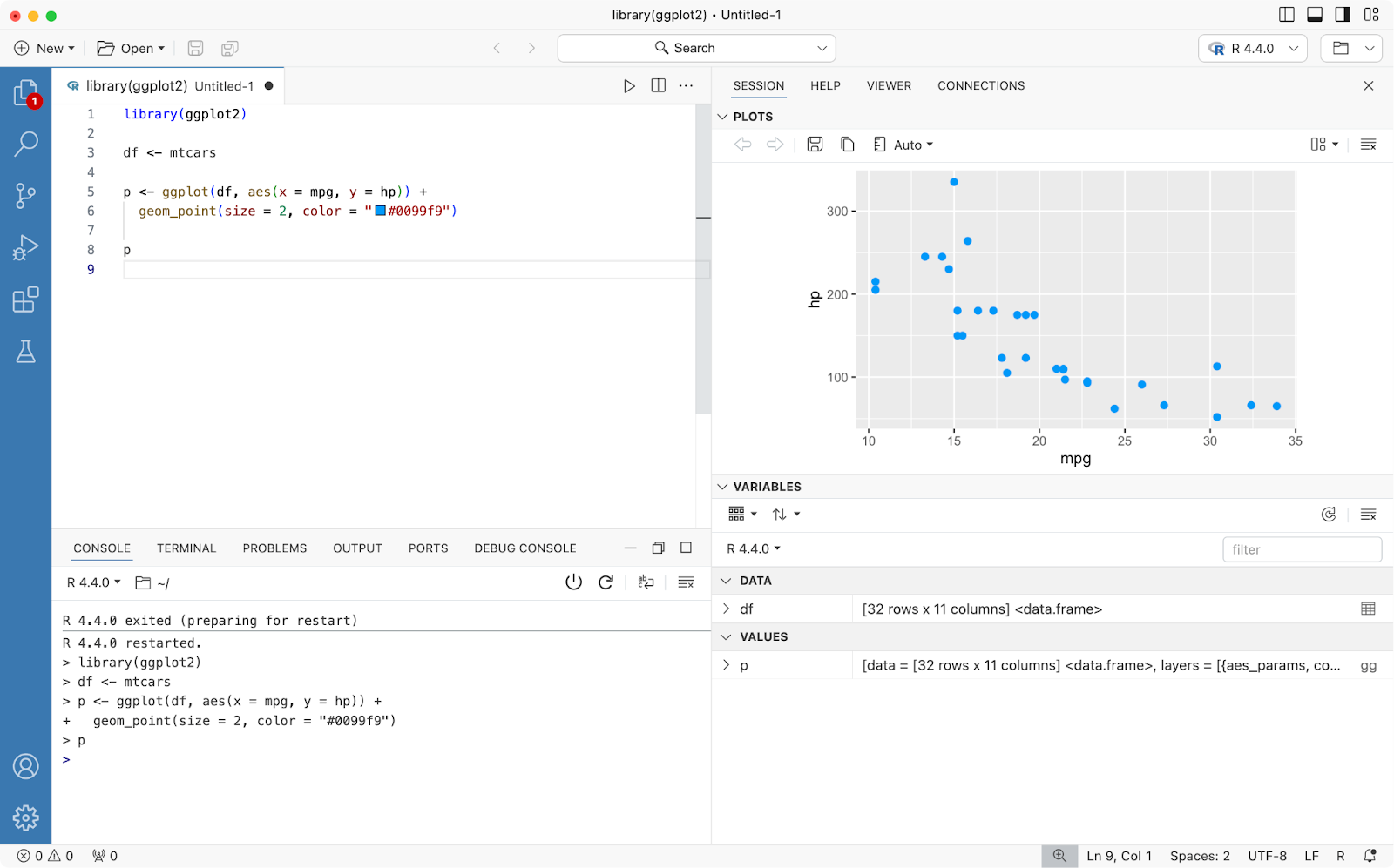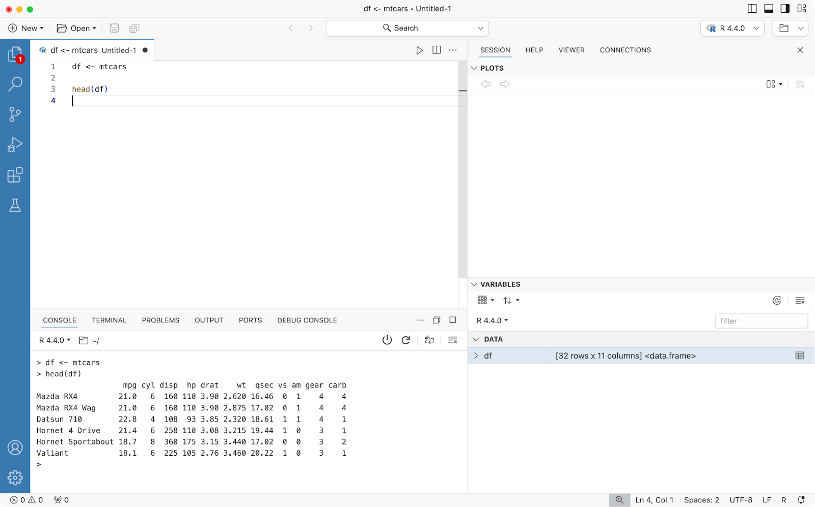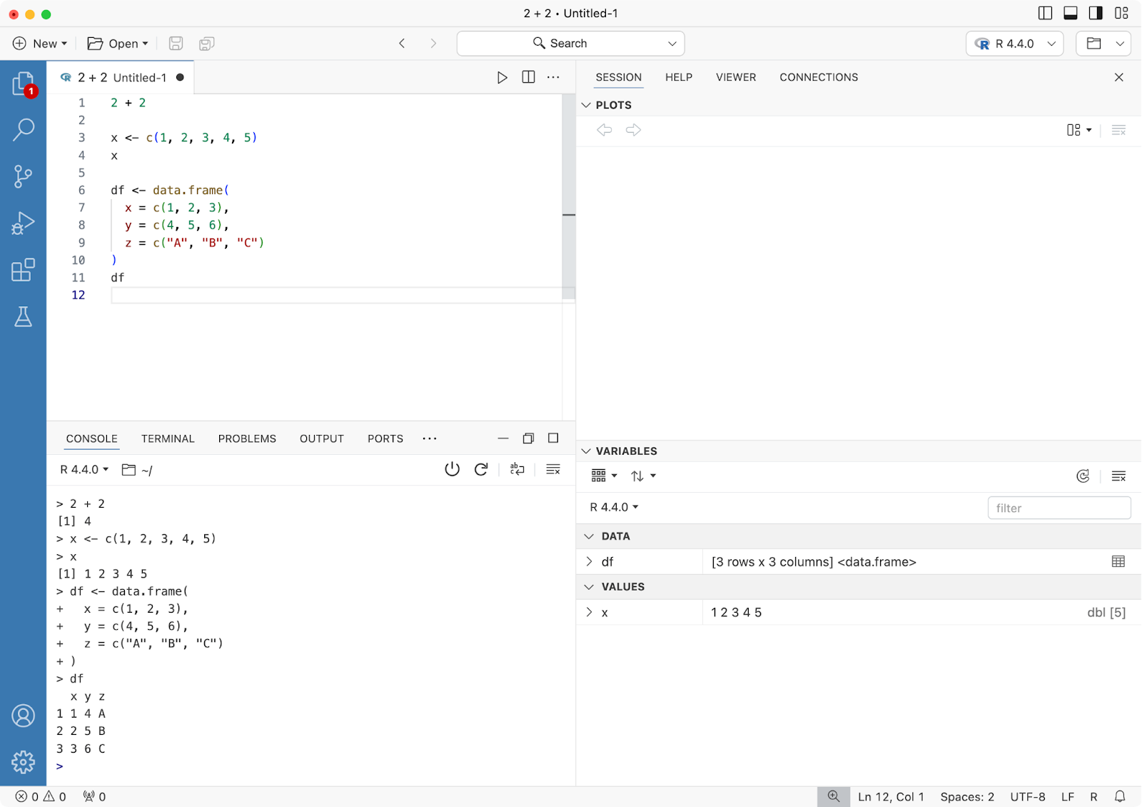 To create a new R script, click on the New File button on the welcome screen and select R File. Writing and running code works just like in RStudio - Command/Control + Enter will run the cell on which your cursor is located: